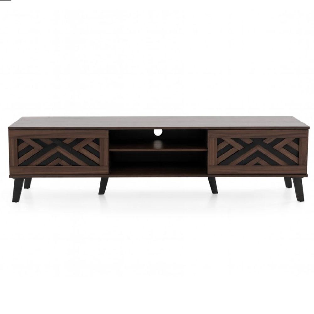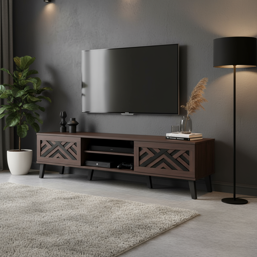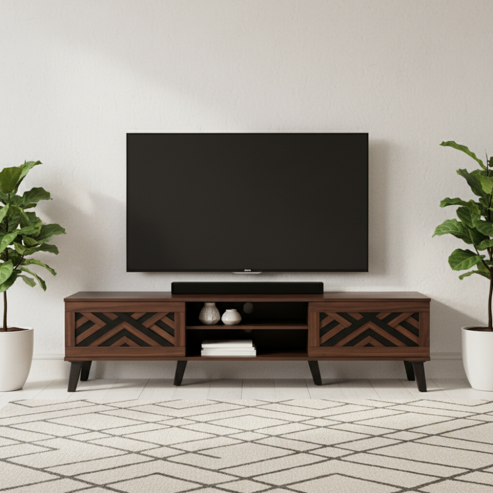 يمكن لهذه الوحدة المصنوعة من الخشب المصمم هندسيًا أن تستوعب شاشات تلفزيون صغيرة إلى كبيرة الحجم.