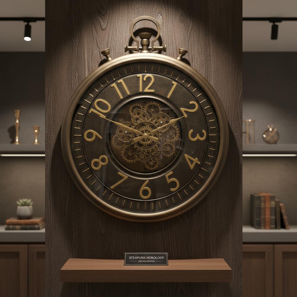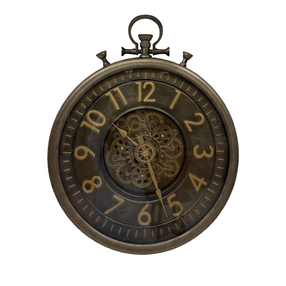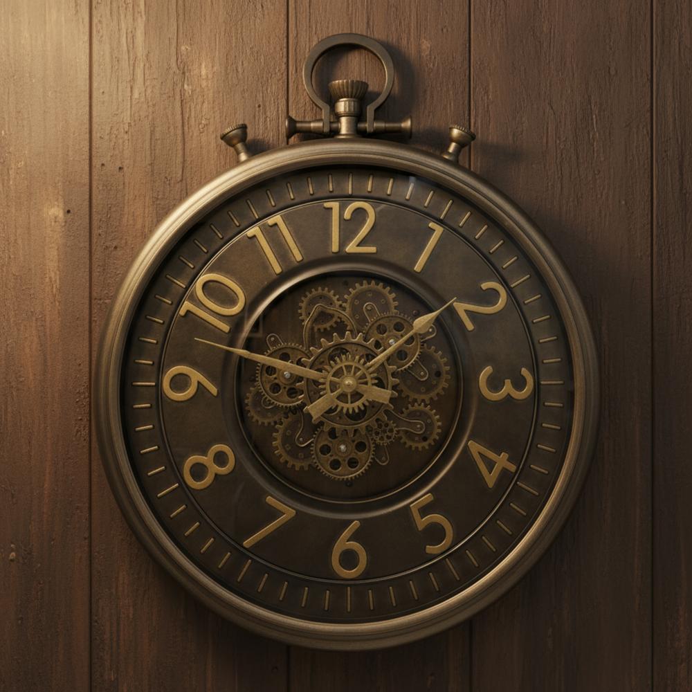 تميز الساعة بإطار معدني داكن وأرقام رومانية كبيرة باللون الرمادي.