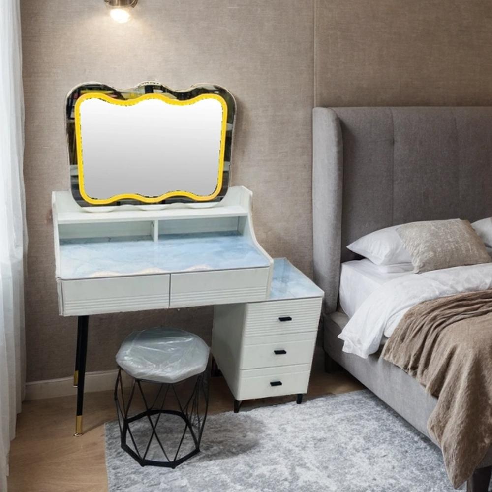 تمتاز بسعة تخزين كبيرة مع تصميم ذكي هيكل من المعدن و الخشب المتين المقاوم للماء و الخدش تحتوي على مرآة مدمجة بحجم جيد و أرجل مصنوعة من الفولاذ المقاوم للصدأ وتأتي مع كرسي من الخشب المغطى بالجلد عالي الجودة