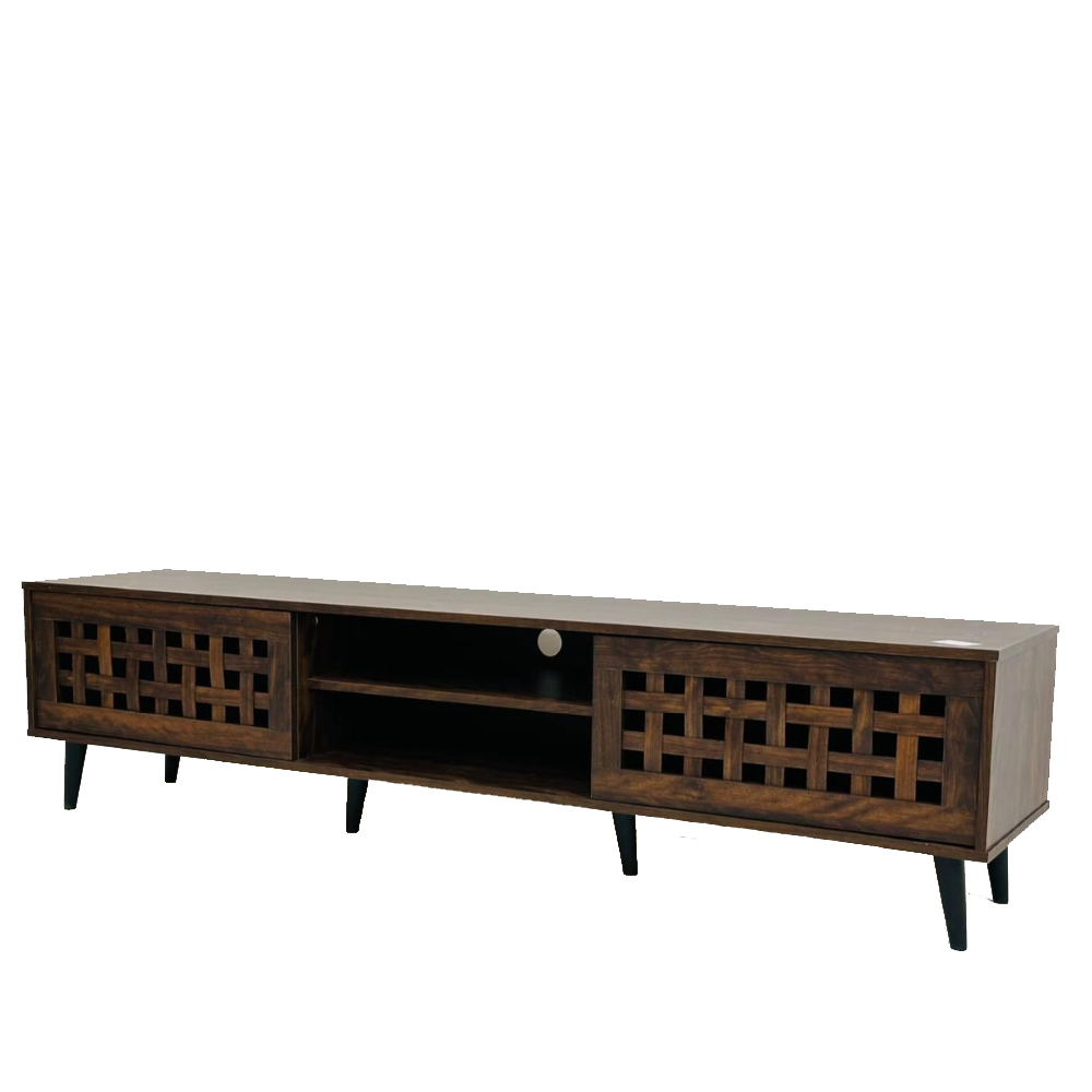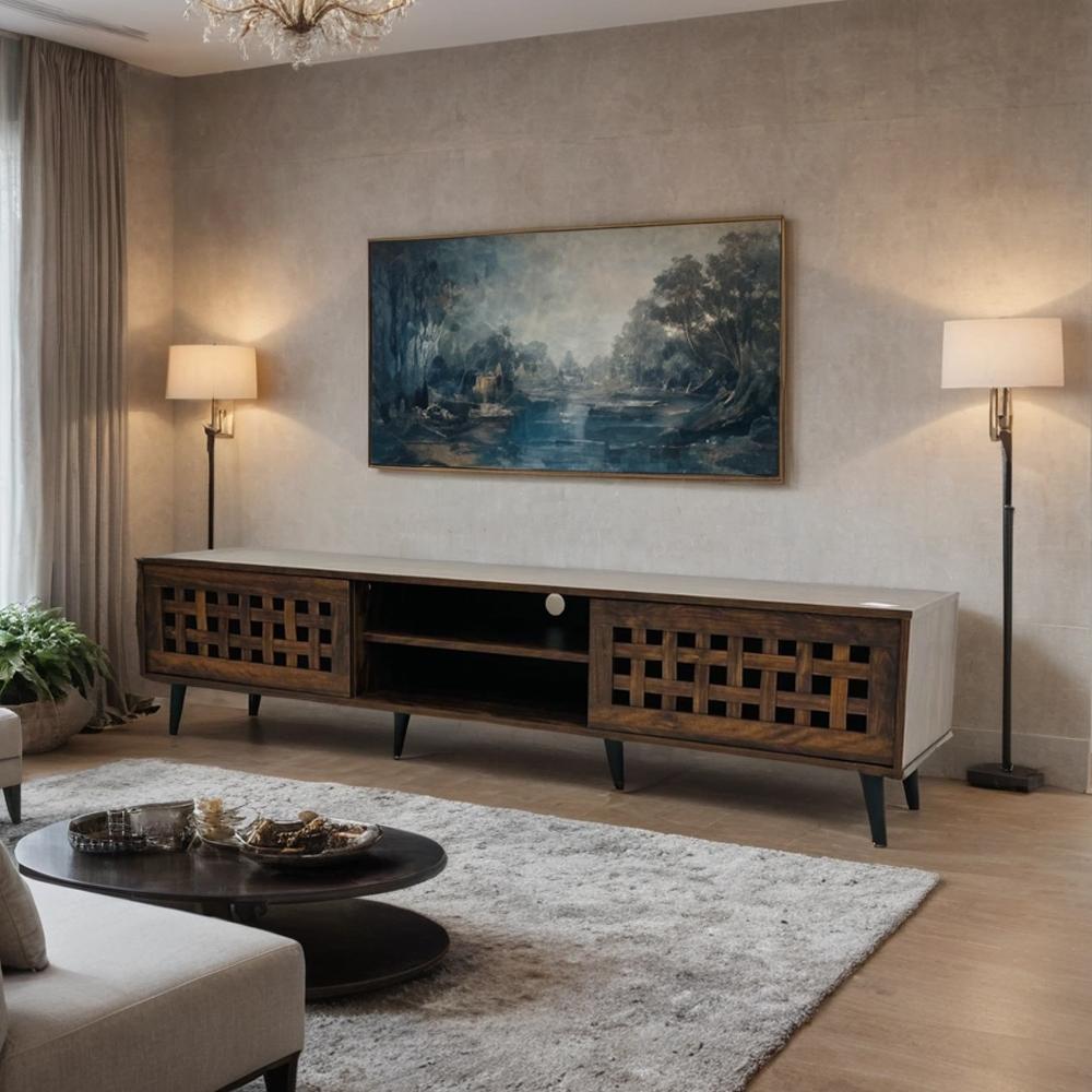 يمكن لهذه الوحدة المصنوعة من الخشب المصمم هندسيًا أن تستوعب شاشات تلفزيون صغيرة إلى كبيرة الحجم.