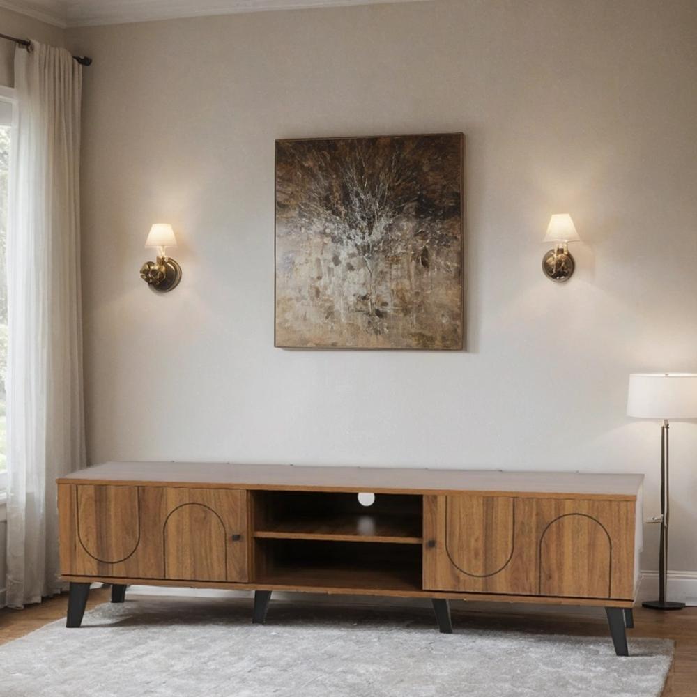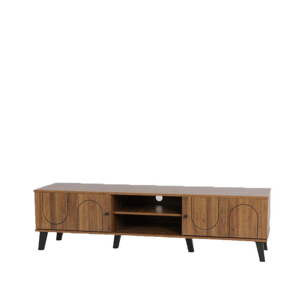 يمكن لهذه الوحدة المصنوعة من الخشب المصمم هندسيًا أن تستوعب شاشات تلفزيون صغيرة إلى كبيرة الحجم.