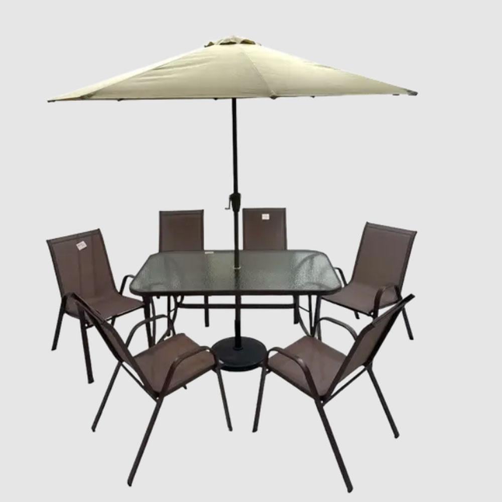 يضم طاولة مستطيل 6 كرسي ومظلة مع تشطيب رائع وقوائم متينة .