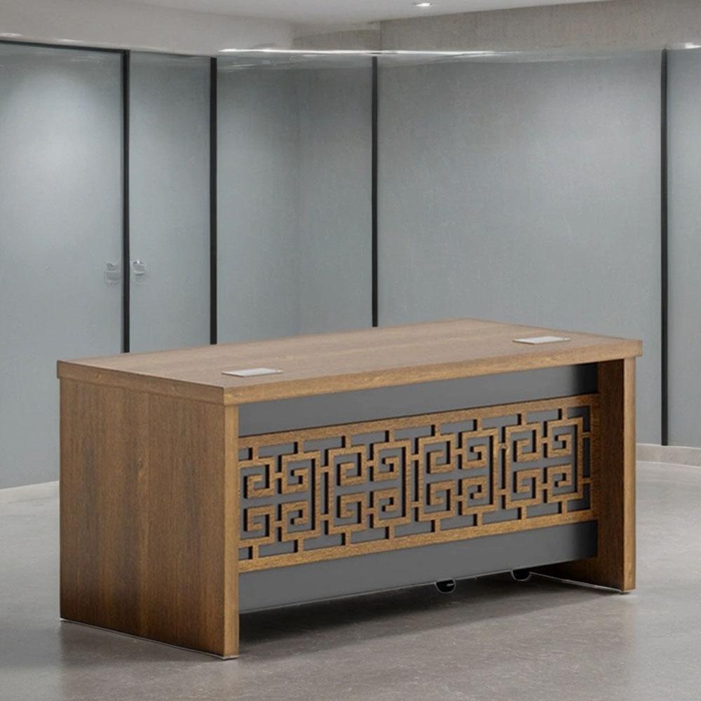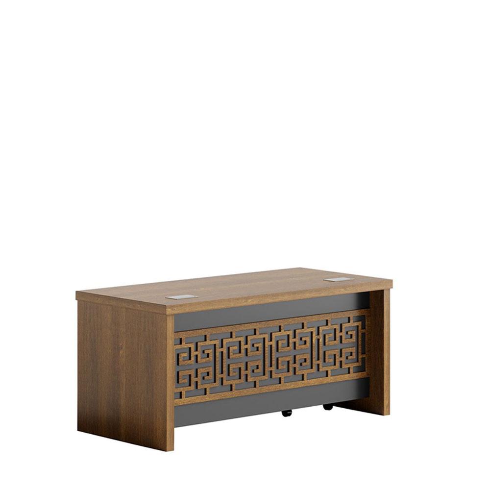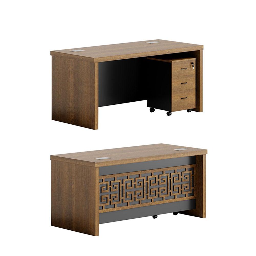 مواصفات مكتب عمل خشبي مع وحدة أدراج متحركة لون بني بنقوش مقاس 140 سم :