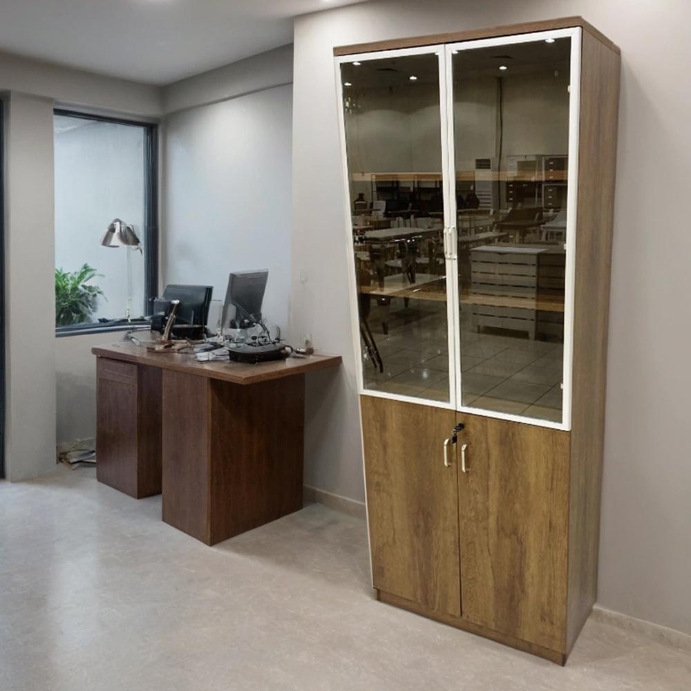 أضف لمسة من الرقي والتنظيم إلى مكتبك أو منزلك مع دولاب التخزين المكتبي المصمم ببابين تجمع بين الزجاج الشفاف والخشب المغلق. تصميم متين يوفر لك عرض المحتويات بأناقة في الجزء العلوي وتخزين آمن ومغلق في الجزء السفلي.